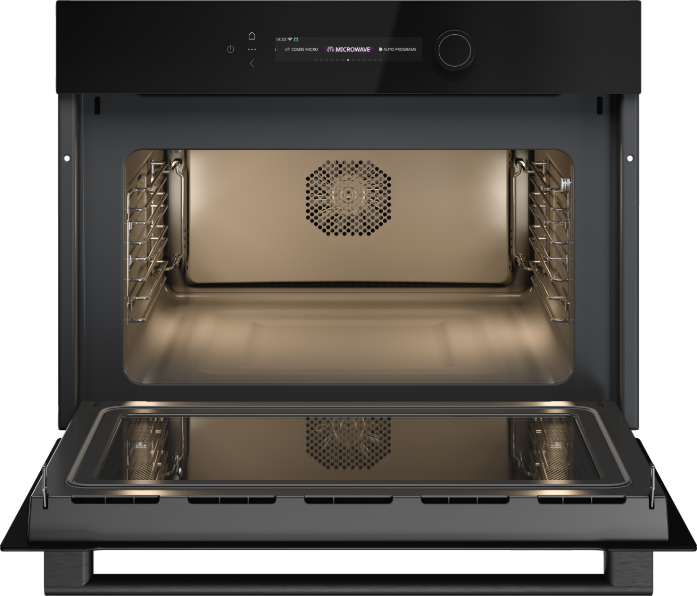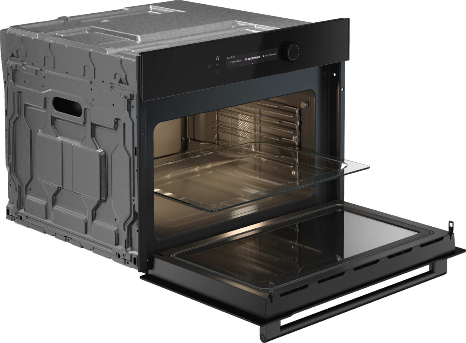 Фронтальная панель из черного стекла с контрастными элементами управления выглядят стильно в интерьере. Цветной TFT‑экран обеспечивает интуитивное восприятие информации, а сенсорные элементы обеспечивают простоту навигации. Двухстороннее галогенное освещение гарантирует равномерную подсветку рабочей камеры объёмом 50 литров, а трёхслойная дверца с технологией Microwave CoolDoor сохраняет внешнюю поверхность холодной при эксплуатации. Плавное движение дверцы и высококачественная пиролитическая эмаль внутри корпуса облегчают ежедневный уход, благодаря функции Aqua Clean можно справиться со сложными загрязнениями. Инверторная генерация микроволн мощностью 1000 Вт позволяет достичь равномерного прогрева, пошаговое приготовление и 40 автоматических программ дают гибкость при приготовлении разнообразных блюд. Встроенные режимы размораживания, таймер, отсрочка старта и сохранение рецептов обеспечивают удобство планирования, а звуковой сигнал и защита от детей повышают безопасность. Съёмные направляющие упрощают обслуживание. Стеклянный противень позволяет готовить различные блюда.