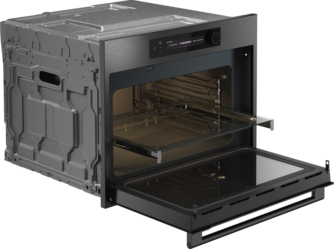 Дизайн ориентирован на чистые линии и практичность: декоративная отделка чёрной стали выдержана в спокойной гамме, а защитное покрытие предотвращает следы эксплуатации, сохраняя презентабельный вид без лишних усилий. Панель управления интуитивна, а цветной экран даёт быстрый доступ к списку функций и настройкам; сенсорное взаимодействие в сочетании с механическим поворотным элементом обеспечивает точность выбора параметров. Эргономика продумана для встроенного монтажа: оптимальные высота и глубина позволяют сочетать прибор с разными конфигурациями мебели, а удобные направляющие делают работу с горячими блюдами безопаснее. Подсветка с регулировкой цветовой температуры создаёт дополнительные визуальные сценарии — от тёплой подсветки при подаче завтрака до холодного акцента для вечерней готовки. Система защиты от детей блокирует доступ к ключевым командам, сохраняя настройки и предотвращая случайные изменения; функция сохранения программ полезна тем, кто экспериментирует с рецептами и хочет фиксировать удачные параметры.