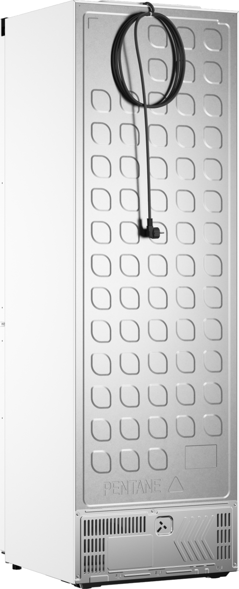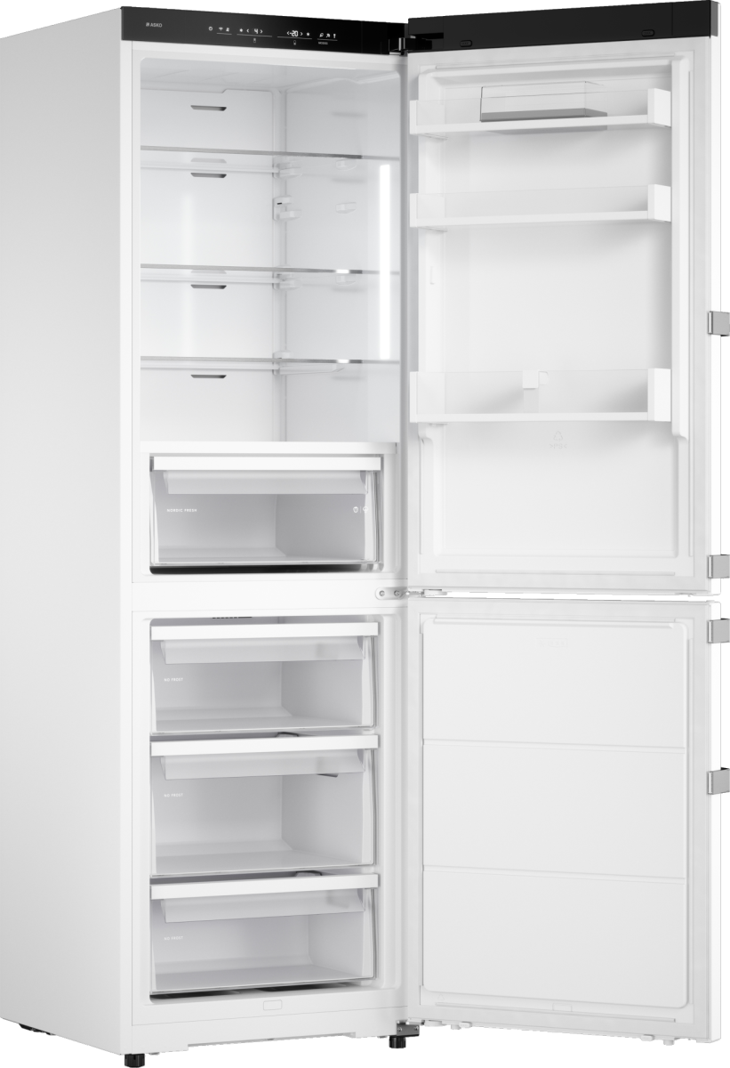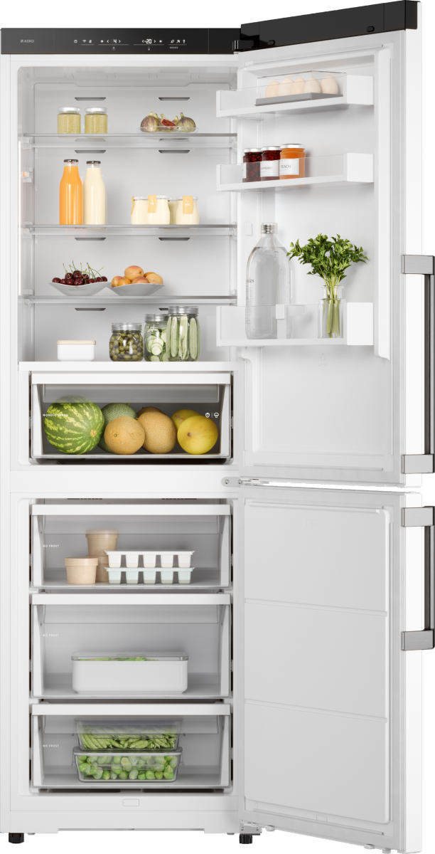 Модель ASKO RFC286KNBW1 внешне выглядит лаконично: светлый корпус без ярких акцентов легко встраивается в любую кухонную обстановку — от скандинавского минимализма до классики. Его габариты — 185×59×59 см — делают его высоким, но узким, что идеально подходит для стандартных ниш или размещения вдоль стены без ущерба для свободного пространства. Управление реализовано через встроенную сенсорную панель с дисплеем, которая органично вписана в фасад — никаких выступающих элементов, только чистые линии. Внутри — 306 литров полезного объёма: 200 л отведено под холодильную камеру, а 106 л — под нижнюю морозилку, состоящую из трёх отсеков и одного выдвижного ящика для удобного доступа. Четыре прочные стеклянные полки выдерживают даже плотную загрузку и легко моются, на дверце — три полочки плюс специальная зона под бутылки, что особенно удобно для хранения напитков. Светодиодная подсветка равномерно освещает всё пространство, а настройка температуры происходит через сенсорный дисплей с адаптивной системой, автоматически корректирующей режимы под текущую обстановку внутри камер.