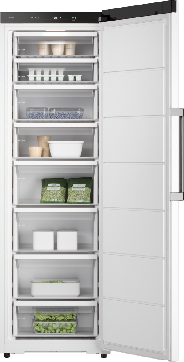 Морозильная камера ASKO RFF286KNCW1 — стильное и продуманное решение для хранения больших запасов продуктов. Устройство выполнено в классическом белом цвете и отличается строгими линиями, аккуратно вписывающимися в интерьер кухни или подсобного помещения; вертикальная компоновка высотой 186 см экономит полезную площадь, предлагая при этом внушительный внутренний объём с удобной организацией полок и ящиков. Сенсорное электронное управление с информативным дисплеем обеспечивает быстрый доступ к настройкам, а режим быстрого замораживания Fast Freeze позволяет сохранить структуру и вкус свежих ингредиентов при интенсивной нагрузке. Адаптивный температурный контроль анализирует внутренние условия и автоматически корректирует работу компрессора для стабильного поддержания заданного режима, что особенно важно при частом открытии дверцы. Полезный объём 294 литра распределён между восьмью отсеками, которые удобно сортируют продукты по категориям, упрощая доступ и минимизируя контакт с внешним воздухом. Система NoFrost исключает образование наледи, избавляя от необходимости ручного размораживания и сохраняя постоянный поток холодного воздуха по всей камере благодаря динамической системе охлаждения. Освещение LED гарантирует равномерную подсветку содержимого, а возможность перенавесить дверь и регулировать высоту ножек упрощают монтаж и настройку под любые условия установки; дверь оборудована дверным упором, допускающим установку справа либо слева, что повышает гибкость размещения. Встроенные системы оповещения срабатывают при открытии дверцы или при повышении температуры, предупреждая о потенциальной угрозе порчи запасов; звуковой и световой индикаторы дают понятные сигналы, позволяя быстро принять меры. Тщательно подобранный фреон R600A обеспечивает эффективный теплообмен при низком воздействии на окружающую среду, а один надёжный компрессор в сочетании с вентилятором поддерживает оптимальную циркуляцию воздуха при минимальном уровне шума всего 34 дБ, что делает устройство комфортным в бытовом применении. Технические параметры включают энергопотребление класса A++ и годовой расход 297 кВт/ч, мощность замораживания 16 кг в сутки и потребляемую мощность 180 Вт, что обеспечивает баланс между производительностью и экономичностью. Длина кабеля три метра и стандартные параметры электропитания 220-240 В при частоте 50/60 Гц упрощают подключение к домашним сетям; изделие поставляется с двухлетней гарантией производителя и произведено в Сербии, а продуманная упаковка гарантирует безопасную доставку, учитывая вес в упаковке 71,5 кг и габариты транспортной коробки.