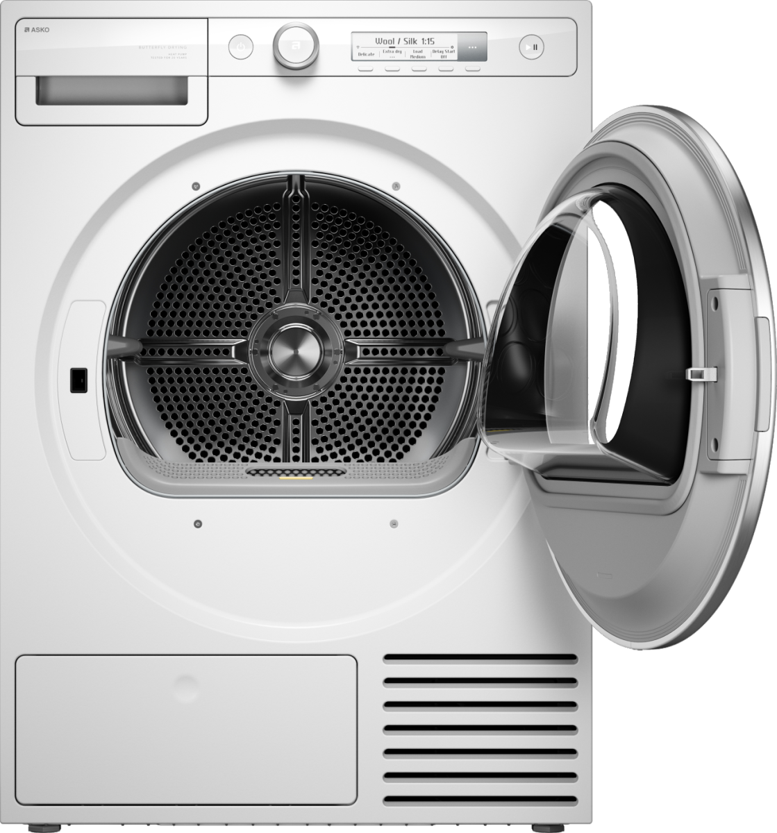 Система Sensidry™ автоматически отслеживает уровень влажности и корректирует процесс в реальном времени, исключая пересушивание. Управление реализовано через LCD-дисплей и тактильные кнопки: интерфейс интуитивен, отображает оставшееся время и позволяет точно задать степень сухости. Доступны таймер отсрочки старта и функция сушки по времени. По завершении цикла срабатывает звуковой сигнал.
