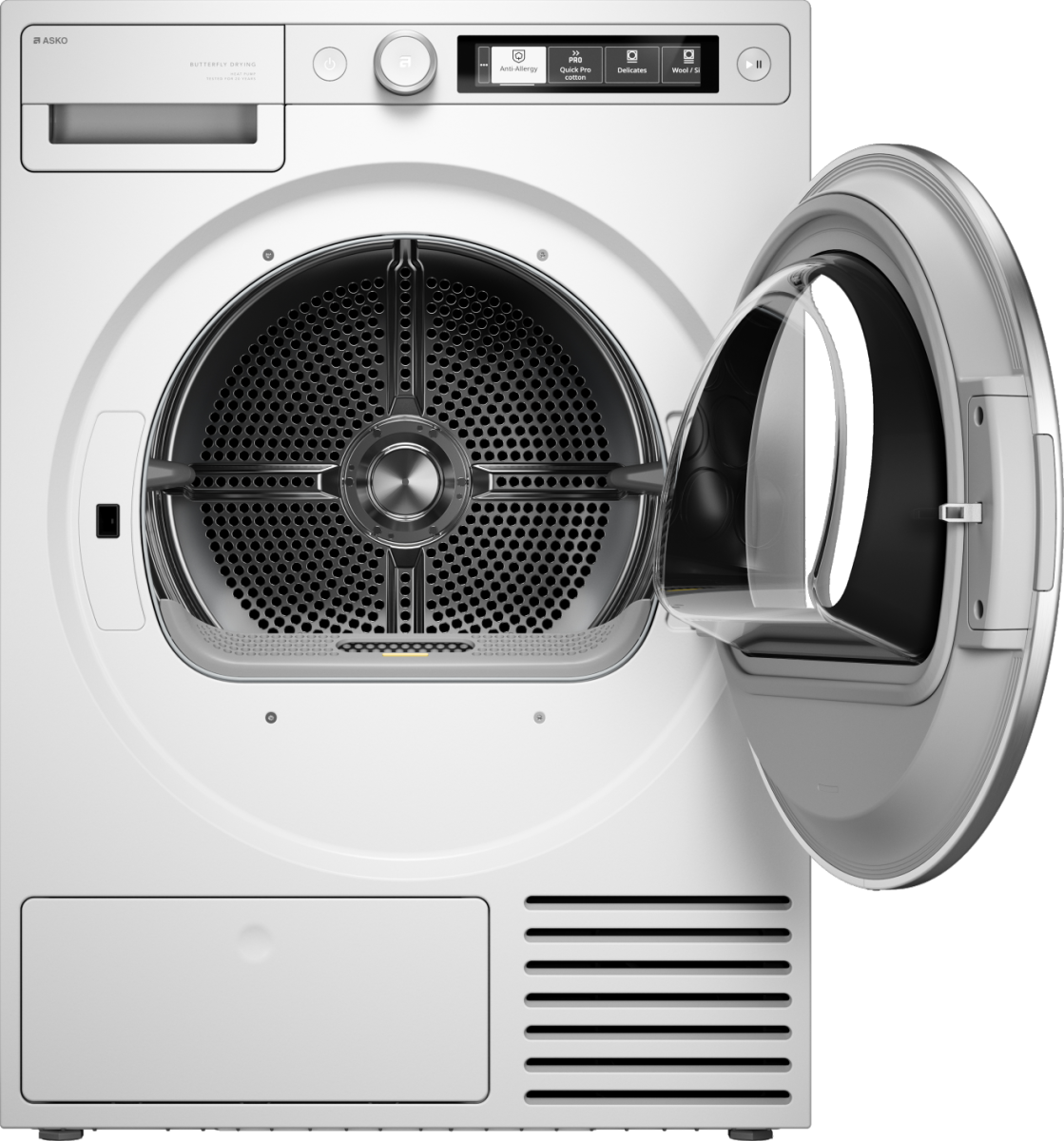 Сушильная машина ASKO T509HRW — это образец скандинавского минимализма и инженерной продуманности. Её белоснежный фронт и чёткие линии корпуса легко вписываются в любой интерьер, от классической кухни до современной прачечной. Цветной TFT-дисплей и кнопочное управление расположены эргономично, обеспечивая быстрый доступ к настройкам без визуального перегруза. Фронтальная дверца с возможностью перенавешивания и встроенной подсветкой упрощает загрузку даже в условиях слабого освещения.