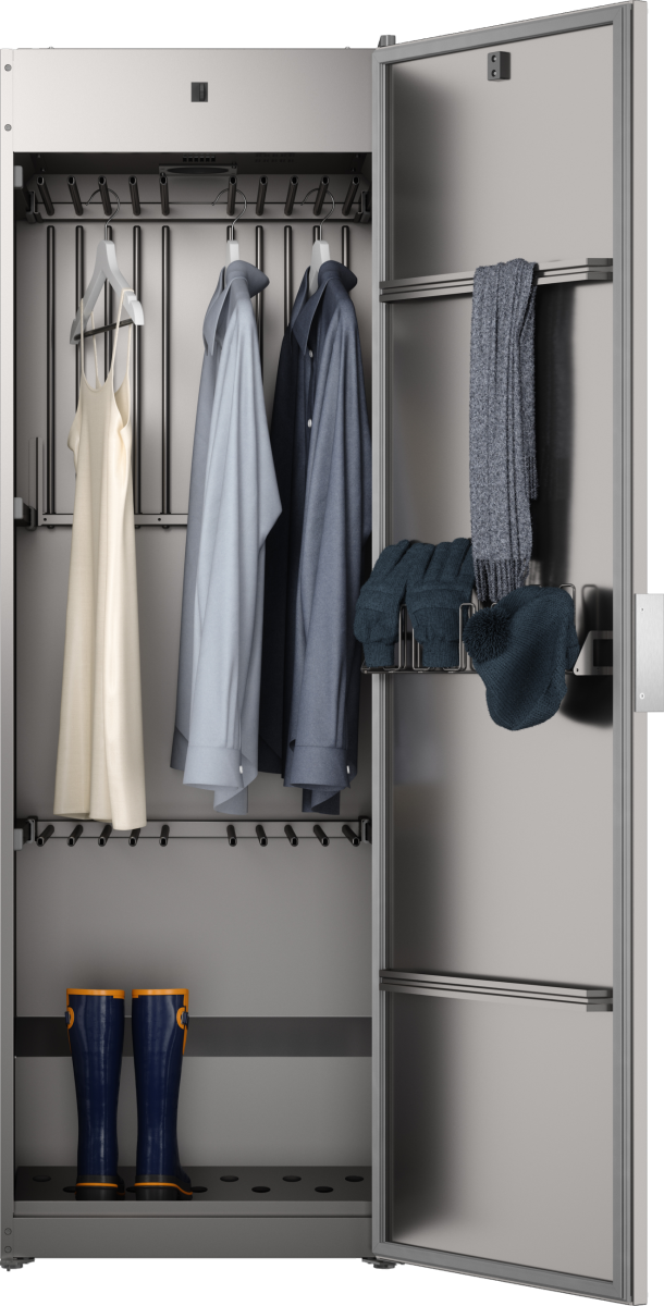 Сушильный шкаф ASKO DC7784V.T — элегантное и функциональное решение для щадящей обработки деликатных изделий в домашних условиях. Внешняя отделка цвета титан и панель управления из нержавеющей стали подчёркивают премиальную эстетику, при этом корпус выполнен из прочной нержавейки, обеспечивающей простоту ухода и устойчивость к коррозии. Высота 184 см при ширине 59,5 см и глубине 60,8 см делает прибор компактным, хотя вместимость рассчитана на 4 кг тканей; общая длина вешалок достигает 16 метров, что позволяет аккуратно развесить блузы, рубашки, пальто и аксессуары. Возможность установки в нише либо закрепления к стене добавляет свободы при планировке интерьера. Дверной упор расположен справа по умолчанию, но дверцу можно перенавесить под нужное расположение, а встроенный дверной выключатель обеспечивает безопасность при работе.