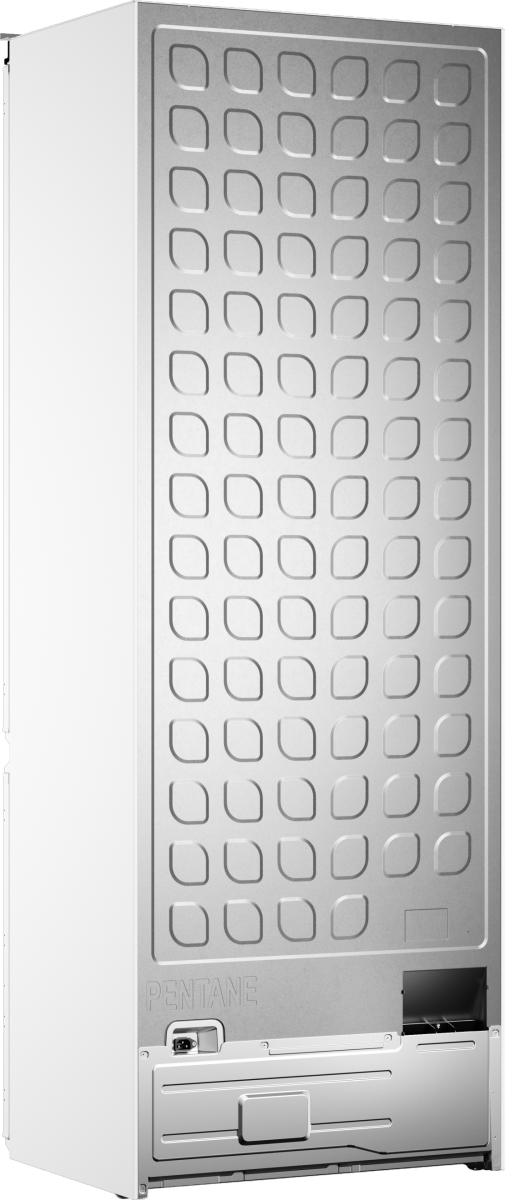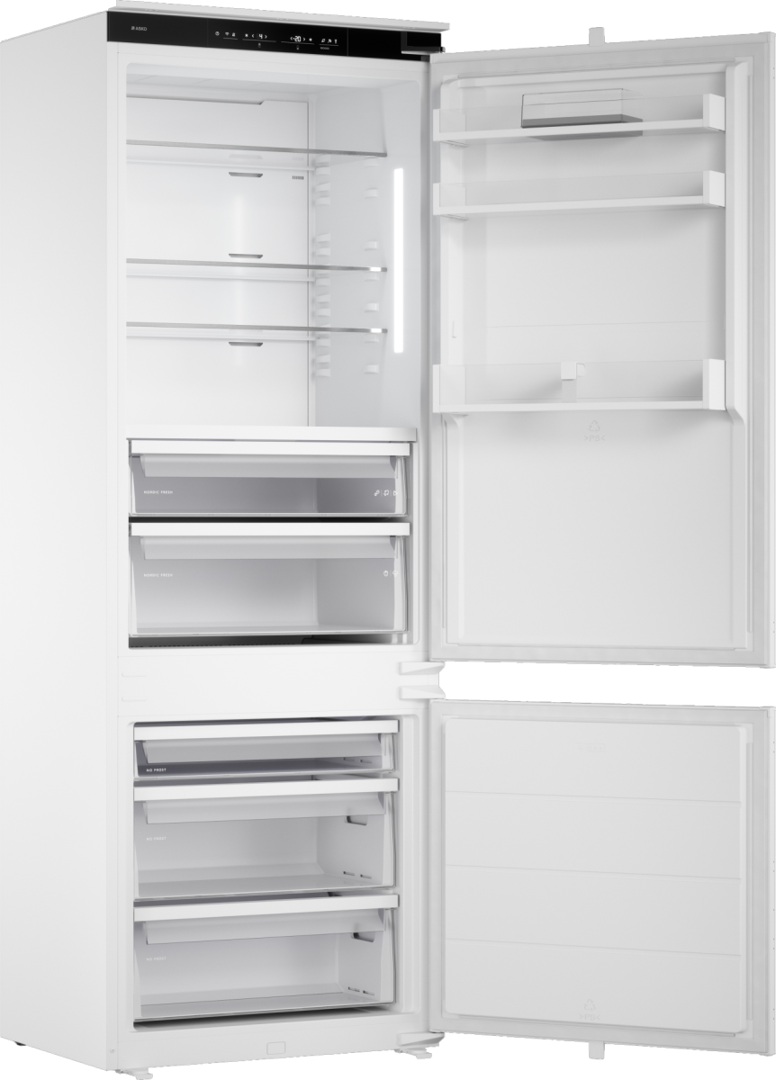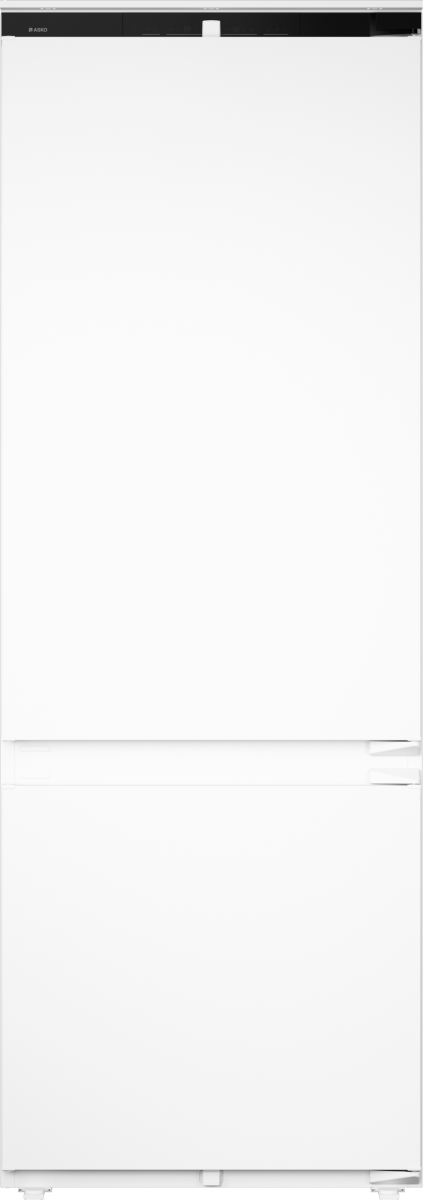 Холодильник ASKO RBC297SND1 выглядит просто и элегантно: светлый корпус и ровная передняя панель не бросаются в глаза, но отлично сочетаются с любыми фасадами. Он предназначен для встройки в нишу размером 194-194,5 × 71-72 × 56 см. Сам прибор имеет габариты 193,6 × 69 × 54,4 см — компактная глубина и точные пропорции позволяют аккуратно вписать его даже в узкую кухню. Благодаря скользящей системе крепления вы можете установить родную дверцу шкафа прямо на корпус, сохранив единый стиль. Дверь по умолчанию открывается справа, но при необходимости её можно перенавесить. Вес — 92 кг (в упаковке — 94 кг), габариты коробки — 200,5 × 74,5 × 59 см.