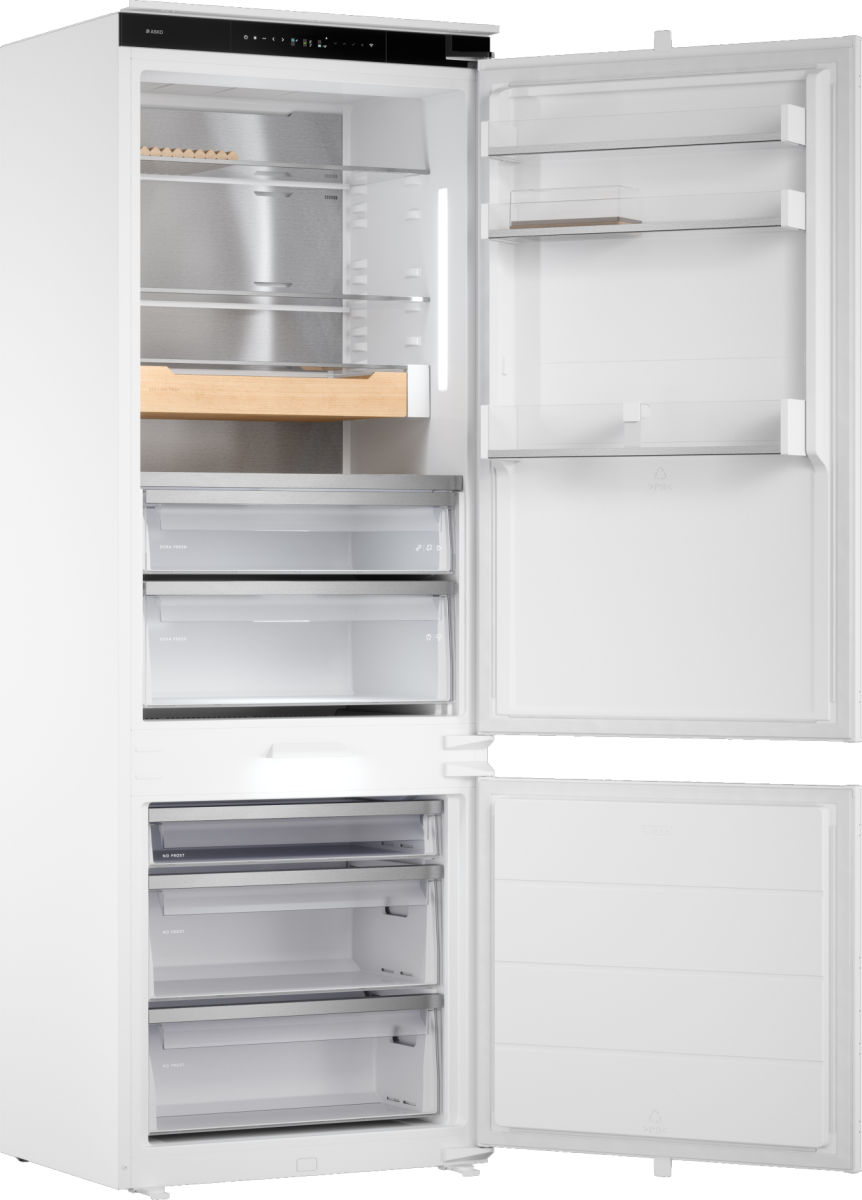 Модель выполнена в лаконичном дизайне с белой эмалированной поверхностью, что позволяет гармонично вписать её в любой кухонный гарнитур. Устройство рассчитано на нишу размером 194–194,5 × 71–72 × 56 см. Его габариты — 193,6 см в высоту, 69 см в ширину и 54,4 см в глубину. Общий объём составляет 370 литров: из них 266 л приходится на холодильную камеру и 104 л — на морозильную. Внутри предусмотрены четыре полки из закалённого стекла, три дверных кармана, отдельная полка для бутылок, а также два выдвижных ящика и три секции в морозилке — всё это обеспечивает гибкую и удобную организацию хранения.