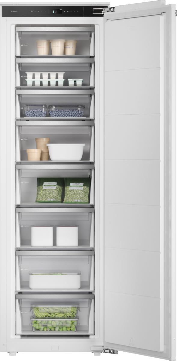 Встраиваемая морозилка ASKO RBF576DND1 выполнена в светлом, нейтральном оттенке, который идеально сочетается с любыми фасадами. Благодаря системе Door-on-Door вы можете установить родную дверцу кухонного шкафа прямо на корпус — результат: ровная поверхность без визуальных разрывов. Дверной упор расположен справа, что упрощает планировку открывания под вашу кухню. Габариты корпуса — 177 см в высоту и 54 см в глубину — рассчитаны на стандартную нишу размером 177,5-178 × 56-57 × 56 см, поэтому при монтаже важно соблюсти точные размеры проёма.